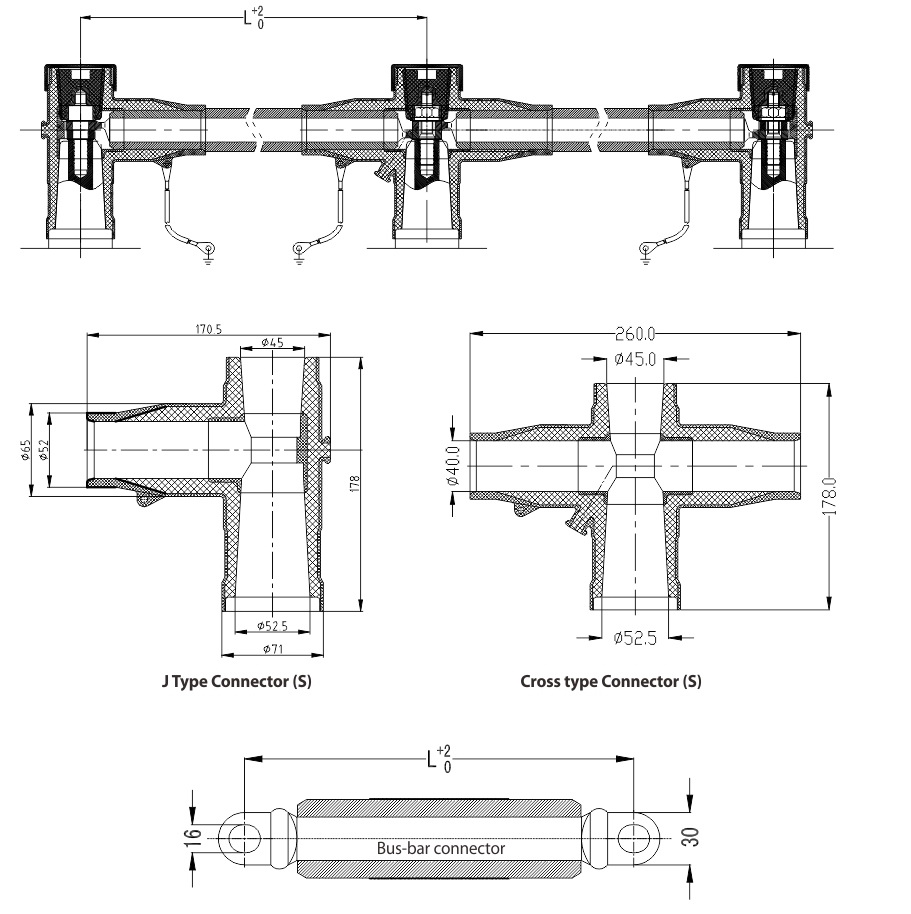 - Applications: BH-HCS 630A top bus-bar hard metal connection system is made of EPDM rubber, mainly applied for the top connection of RMU and cable branch system to fit the loaded switch socket with sealing and insulation function; such special designed connector can be also made screened or unscreened, the RMU can be made more compact and reliable with such special designed connector to balance performance and cost at the same time. Assembled with 630A Europe style cross type connector and bus bar connector, the bas bar system can be realized with multi-connection to the series of switch gears to optimize the connection solution. The length and the shape the connector for both Europe and American style can be tailor made according to your special requirements.