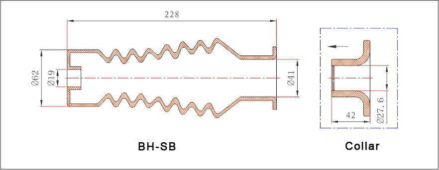 - Applications: BH-SB/BH-TB is premolded bellows boots applied for transformer and switchgear connections with the function of protection, insulating and sealing, it can also reduce the clearance between phase to phase, phase and ground as well. Such boots own outstanding behaviors for the weathering resistance and electrical property esp. in the wet conditions. Configuration 35-400mm2 at 7.2V/17.5kV for straight type insulating boots and 46-70mm2 up to 15kV for T type insulating boots.